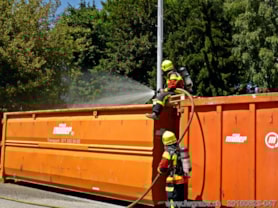 Am zweiten Samstag leisten wir für die Feuerwehr St.Gallen West noch Nachbarschaftshilfe. Zwei Mulden mit mottenden Isolationsmaterial von einem Einsatz der Berufsfeuerwehr St.Gallen, der Milizfeuerwehren St.Gallen Ost und West wurden zum ablöschen auf dem Übungsgelände Hofen gebracht. Da wir bereits auf Platz und mit Atemschutz ausgerüstet waren, übernahmen wir gleich die abschliessenden Ablöscharbeiten.